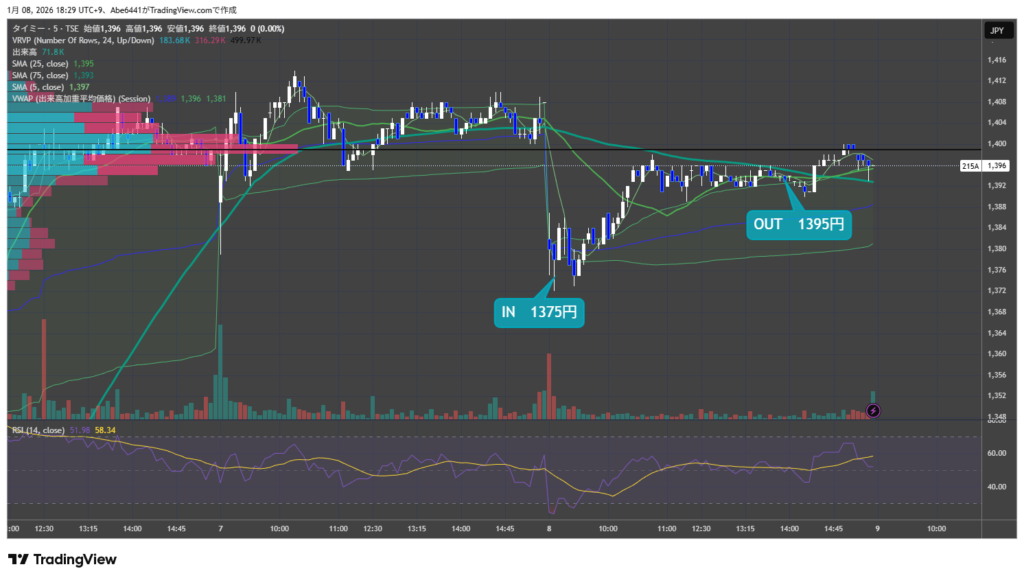 結果から言うと、取れた値幅はわずかです(1,375円IN→1,395円OUTの20円幅)。 今日は木曜日で明日が週末ということもあり、当初予定していた目標値までは引っ張らず、リスク回避で早めに手仕舞いしました。