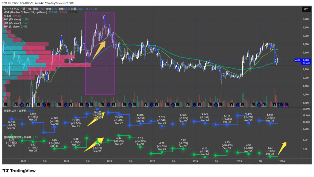 過去、2021年の局面でも同様の現象(在庫減→利益率急騰)が起き、株価は跳ね上がりました。 今回のターゲットは、その再現。いや、高付加価値化が進んでいる分、営業利益率15%〜20%という過去最高水準への到達も夢ではないと見ています。