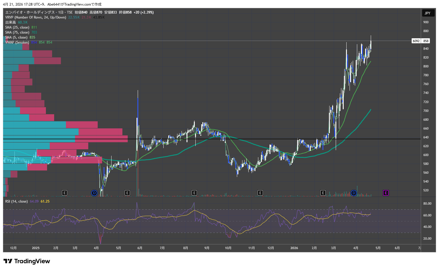日経平均が5万8,000円を超え、どこか浮足立ったような相場が続いています。私は先日、大型株での立ち回りから、再び自分が得意とする小型株へと舵を切り直しました。その中心に据えているのが、エンバイオ・ホールディングス(6092)です。