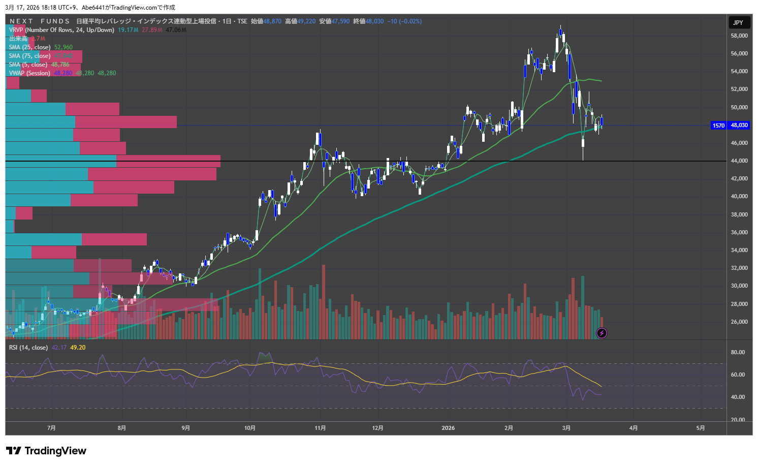 日経レバレッジ(1570)のRSIは依然として30〜32のターゲットには到達していません。じりじりと下げる展開が続いており、正直なところ「入りづらい」というのが本音です。